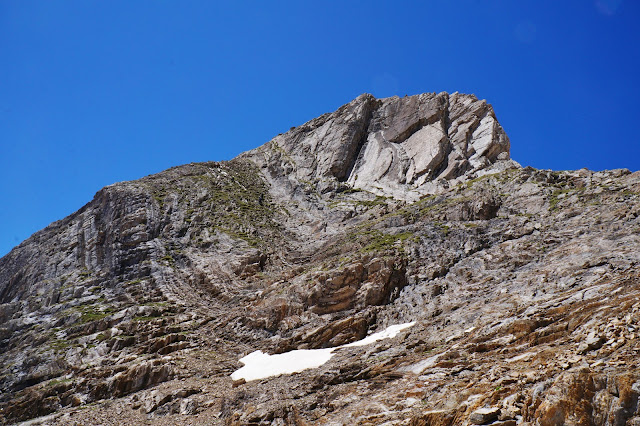 Diente de Llardana mendiaren azpian motxilak utzi eta di-da batean gailur honetara ere igotzea erabaki genuen. Azpitik igo ezina dela iduri du, baina argazkian ikusten den belarrezko diagonaletik nahiko aise igotzen da. Hori bai, esposizio pixka bat du bideak.