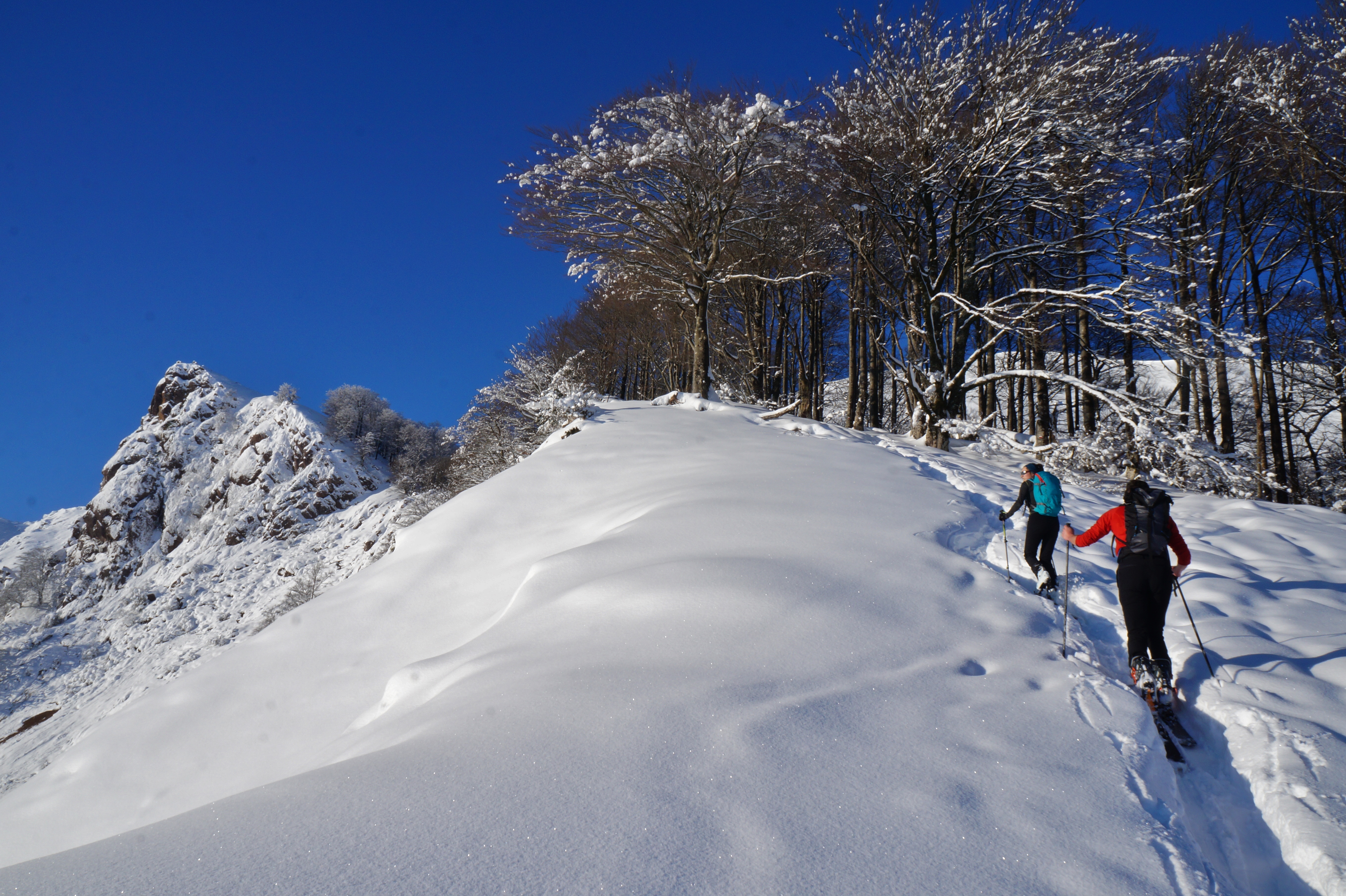 Malda tenteenak elur sakonetik gaindituta, bidea pixka bat lasaitu eta bertze baso zati batean barneratzen da.