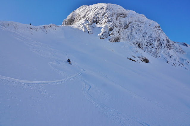 Ondotik eguneko lehen jaitsiera etorri zen. Kaskotik igan ginen zatitik jaitsi ordez, zuzenean mendebaldeko maldak hautatu genituen. Goitiko zatian elur zoragarria izan genuen, 15 bat zentimetroko hauts geruza. Jaitsi ahala geruza hori finduz joan zen, baina elur ona izan genuen.